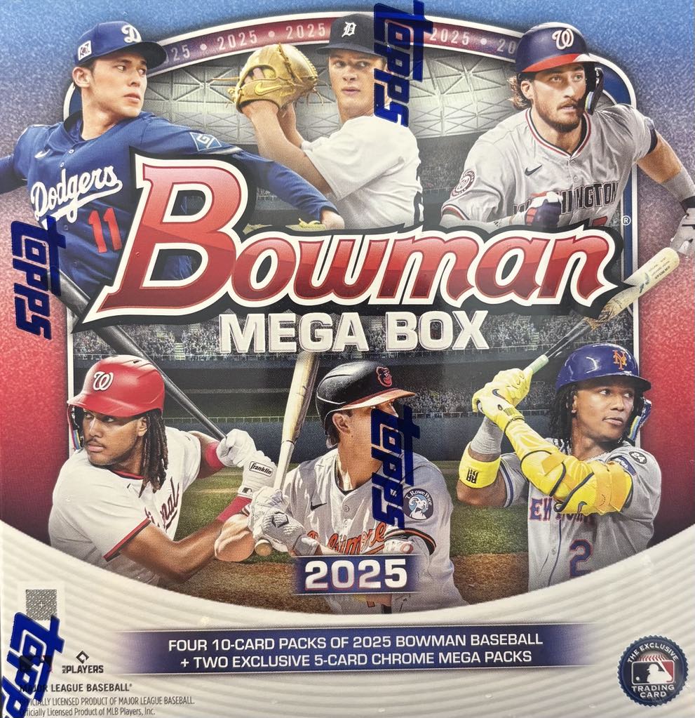 – Look for 4 2025 Bowman Base packs and 2 exclusive Mega Chrome packs per Mega Box!